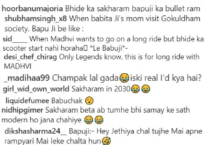 खैर, हुआ यूं कि तस्वीर शेयर करने वाले पैपराजी ने तारक मेहता का उल्टा चश्मा के फैंस से टीएमकेओसी स्टाइल में तस्वीर को कैप्शन देने के लिए कहा. और तब से, प्रशंसक पोस्ट के टिप्पणी अनुभाग में धमाल मचा रहे हैं। नीचे दी गई तस्वीर पर उन्होंने क्या टिप्पणी की है, देखें: